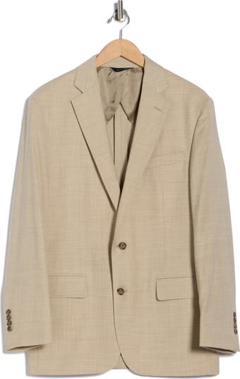 Tailored from a wool blend, this versatile beige sport coat features plenty of stretch and resists wrinkles to keep you looking sharp and feeling comfortable. Unconstructed tailoring, flap pockets and a two-button closure relax the formality to give you a smart finish for any casual or semiformal look.