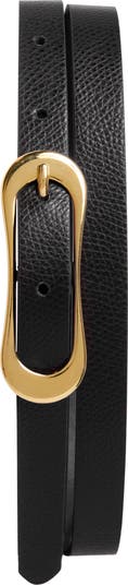 A sculptural buckle with a polished finish fronts a slim Italian-made belt crafted from rich pebble-grain leather.