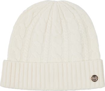 A goldtone logo brands this chunky cashmere beanie that'll add an extra layer of toasty warmth to your look.