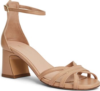 Intersecting vamp straps lend contemporary dimension to a leather sandal set on a cushioned footbed and chunky block heel.