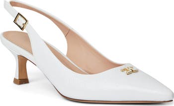 Signature logo hardware and textured patent leather distinguish a slingback pump framed by a pointy toe and kitten heel.