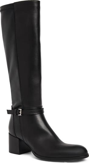 A square toe and stacked heel balance a knee-high boot rendered in buttery suede and fashioned with a side zipper for easy entry.