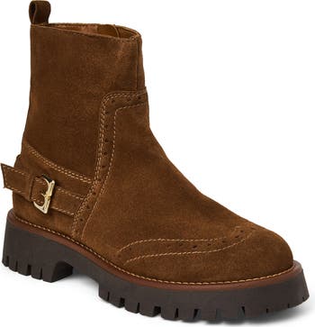 Add a moto-chic twist to your style with this street-smart boot featuring a bold lug sole for traction and metal buckled straps for a touch of shine. A discreet side zipper and supple suede that molds to your feet with every wear complete the thoughtful details of this design.