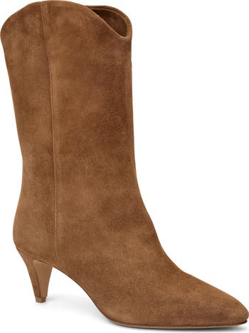 A curved topline and almond toe create a streamlined silhouette on an Italian-made leather bootie set on a tapered kitten heel for a stylish hint of height.
