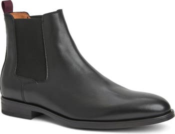 Dual goring insets and a rear pull-tab add classic elements to a sophisticated leather Chelsea boot designed with a plain toe for timeless appeal.