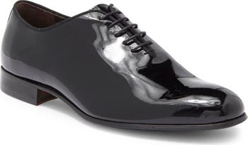 Whole-cut leather with a glossy patent finish furthers the luxe style of this streamlined Italian oxford.