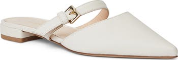 An Italian leather mule offers sophisticated, minimalist appeal with a pointy-toe silhouette punctuated by a midfoot strap.