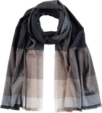 Bundle up when the frigid temps creep in with this silk-cashmere blend scarf woven in a plaid pattern and finished with frayed trim.