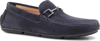 Geometric bit hardware and a squared-off moc toe distinguish an Italian-made loafer grounded by a cushioned footbed and rubber driving sole that wraps up the heel.
