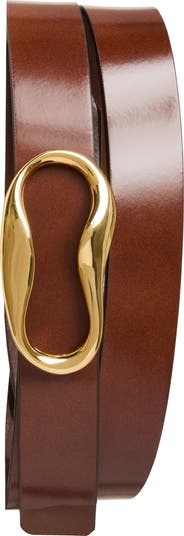 A sculptural buckle with a polished finish fronts an Italian-made belt crafted from smooth leather.