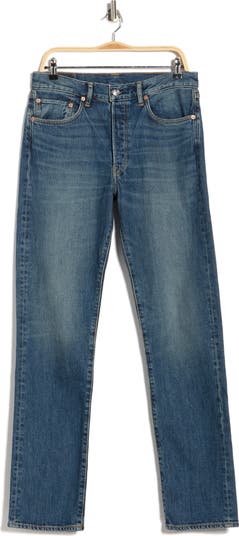 Low-stretch cotton denim distinguishes a casual pair of jeans fashioned with faded thighs and whiskered details for lived-in charm.