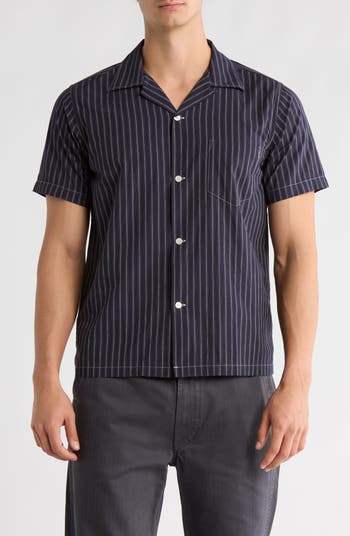 A striped cotton construction creates an easygoing vibe in a button-up camp shirt framed with short sleeves and a convertible collar.
