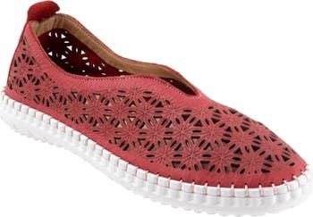 Laser-cut detailing and a notched topline bring contemporary design to an easy slip-on flat set on a lightweight, flexible sole.