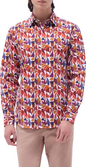 An artful abstract print enlivens a stretch-cotton sport shirt cut for a shaped fit that looks great tucked or untucked.