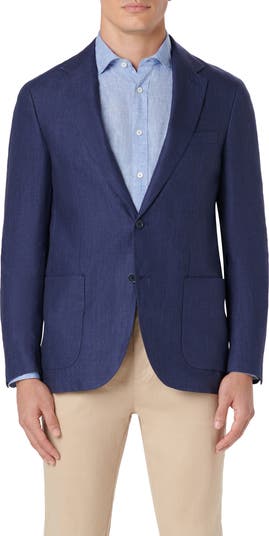 Always stay cool while looking sharp in this breezy linen blazer punctuated by wood buttons and trim-fit patch pockets.
