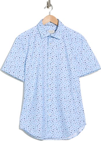 A summery pattern lends warm-weather vibes to a classic button-up shirtt cut from stretch-enhanced cotton to bring comfort and ease to casual or semiformal outings.