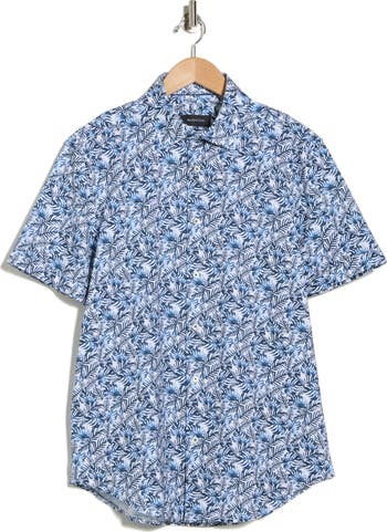 Tropical fronds lend a summery vibe to a posh button-up shirt cut from stretch-enhanced cotton to bring comfort and ease to casual or semiformal outings.