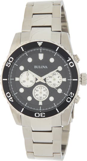 Show off sporty style with this stainless steel chronograph watch featuring three subdials and a unidirectional bezel secured by a polished bracelet strap.