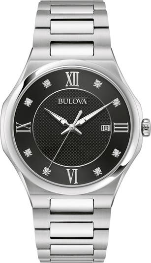 This elegant bracelet watch is forged from stainless steel and centered by a textured dial framed by Roman numerals and bright-white diamond markers.