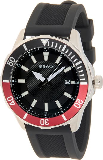 Easy-to-read markers and date window detail the dial of a stainless-steel watch secured by a silicone strap for all-day comfort.