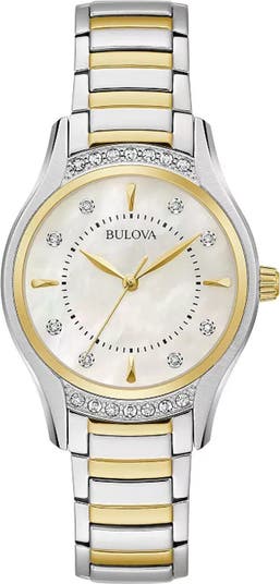 Show off this elegant two-tone bracelet watch featuring a mother-of-pearl dial accented by eight diamond markers and a sparkly crystal bezel.