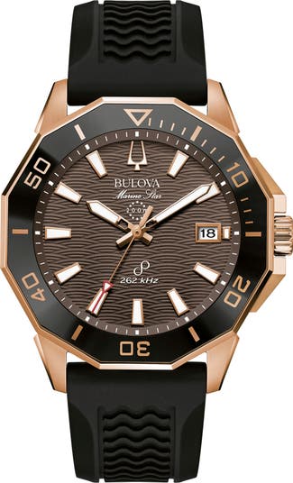 Enjoy the precise timekeeping of this water-resistant silicone-strap watch featuring a wave-like guilloche dial, unidirectional bezel and clear date window. Bulova's proprietary Precisionist movement is a three-prong quartz crystal with a 262kHz vibrational frequency that is eight times greater than standard quartz watches for unparalleled accuracy.