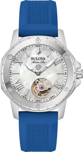Other features: Mother-of-pearl skeleton dial; luminous hands; water resistant to 10 ATM (100 meters).