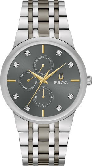 A brushed dial with diamond hour markers and trio of subdials updates the minimalist aesthetic on this stainless-steel watch.