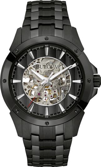 An intricate skeleton dial reveals the precision automatic movement of this stainless steel watch secured by a matte bracelet strap.