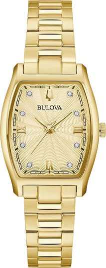 A tonneau-shaped case and eight hand-set diamond indices complete the elegant design of a three-hand watch secured by a timeless bracelet strap.