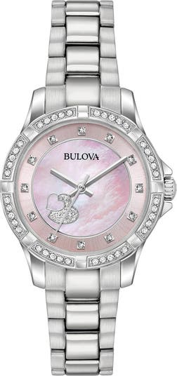 Sparkling Swarovski crystals bring a glamorous element to this luxe stainless steel bracelet watch. - Style #: 96L237 - Style: Bracelet - Gender: Women's - Case Material: Stainless steel - Dial Color: Pink mother of pearl set with Swarovski crystal heart detail - Hands: Silver-tone - Markers: Swarovski crystals - Bracelet Material: Stainless steel - Closure: Foldover - Movement: Analog quartz - Crystal: Mineral - Case Diameter: 30mm - Case Thickness: 8.5mm - Bezel: Swarovski crystal embellished - Imported
