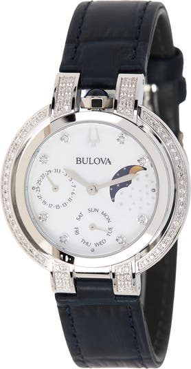 Legendary heritage reinvented in a stainless steel case with synthetic blue spinel cabochon crown at 12 o'clock position and 78 diamonds (0.36 CTW) individually hand set on the case parenthesis, lugs, and white mother-of-pearl dial. Four-hand moon phase functionality, domed Sapphire crystal, black leather strap with light gray interior lining with double-press deployant closure, iconic dye struck "Goddess of Time" dimensional case back, and water resistance to 30 meters.