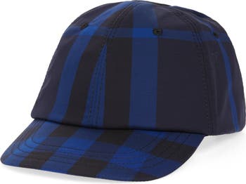 A dark Burberry check explodes in statement scale on a ball cap made of cotton stretch twill with embroidered logo details discreetly marking the back.