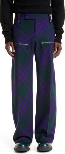 Knit from virgin wool and patterned with purple checks, these runway-showcased trousers also feature clean creases and gleaming zip pockets.