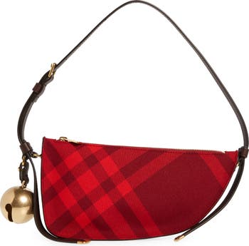 This check-patterned shoulder bag features a modern, asymmetric silhouette and a removable bell charm dangling from the adjustable shoulder strap.