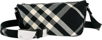 This crossbody in a folded-shield shape is made from fabric woven in the Burberry check pattern set at a jaunty angle and is set with a long adjustable strap. An EKD satin patch is stitched to the lining.