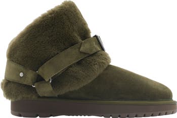Sumptuous genuine shearling belted with a buckle strap lends warmth to a rich suede bootie detailed with Burberry's signature Equestrian Knight on the sole.
