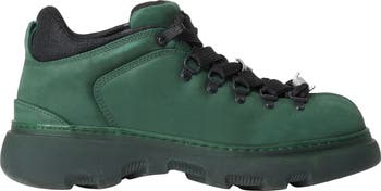 Burberry embraces a punkish aesthetic with barbed wire–inspired hardware on a chunky boot fashioned in Italy from vine-green leather.