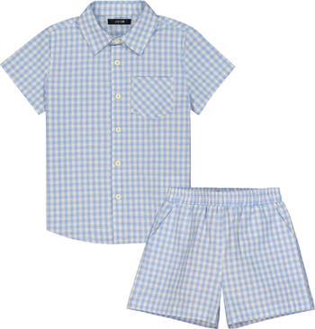 This adorable cotton set that pairs a button-up shirt with matching shorts is done up in classic checks.