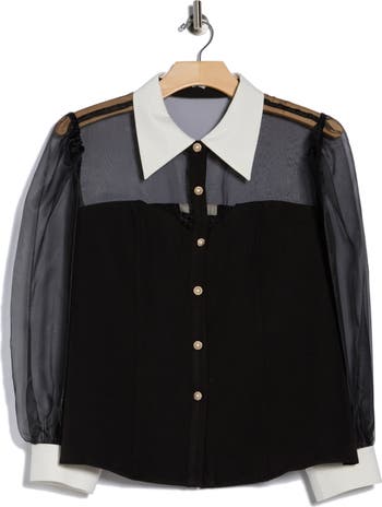A mesh yoke and sleeves add alluring detail to a woven top framed by a high-contrast collar and cuffs to complete your look.