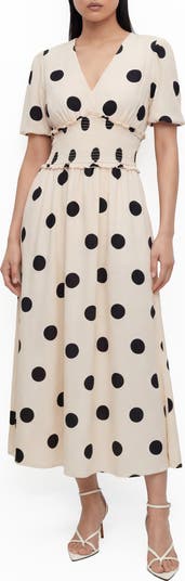 Classic black-and-white polka dots detail this puff-sleeve midi dress designed with a smocked waist for a flattering fit.