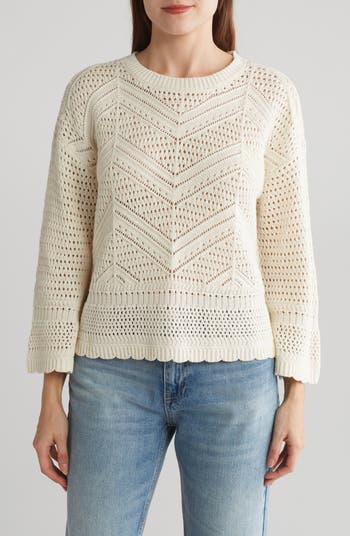 A lightweight openwork sweater knit from soft and stretchy yarn is trimmed in sweet scallops for added charm.