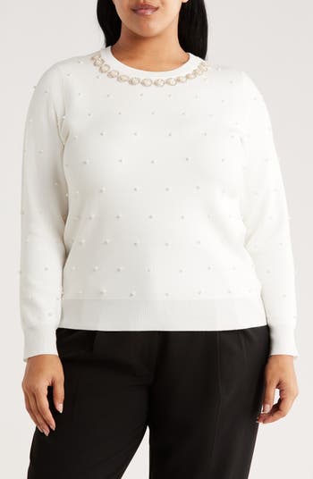 Crystal and pearlescent embellishments lend shimmer and shine to a crewneck sweater that instantly elevates your cold-weather selection.