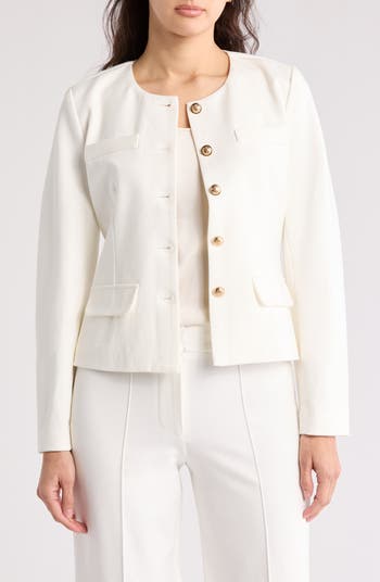 A structured silhouette gives a prim and proper attitude to this ponte jacket that's fronted with a row of shiny buttons.