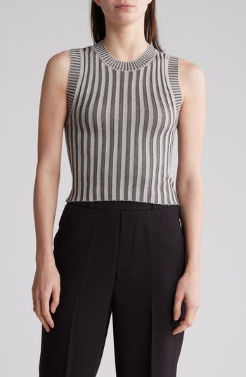 A tonal rib knit construction adds eye-catching texture to a sleeveless sweater.
