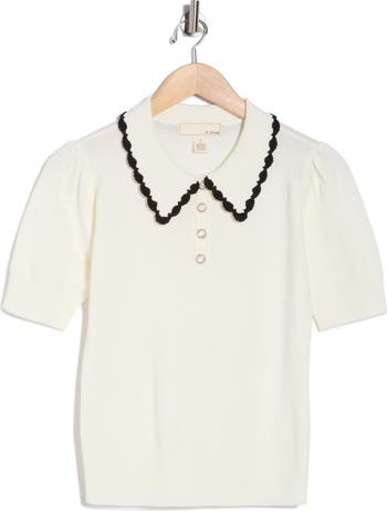 Contrasting lace trim outlines the Peter Pan collar of this short-sleeved sweater finished with pearly buttons.
