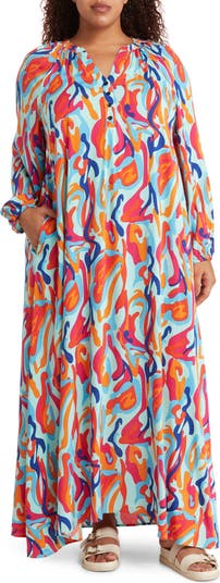 A bold print covers this flowy and fabulous dress framed by long sleeves and cut to a fluttery maxi length.
