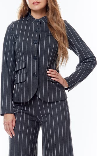 Elevate your work wardrobe with a heavy ponte blazer featuring a band collar and multiple pockets for contemporary style.