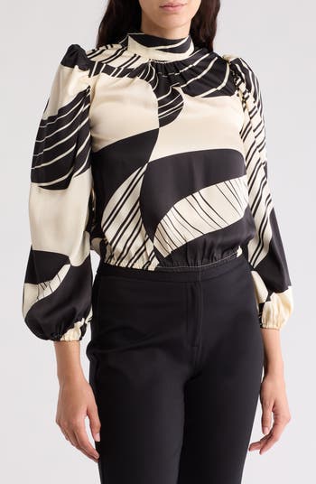 A bold print covers this blousy mock-neck top framed by billowy long sleeves and finished with an elastic hem.