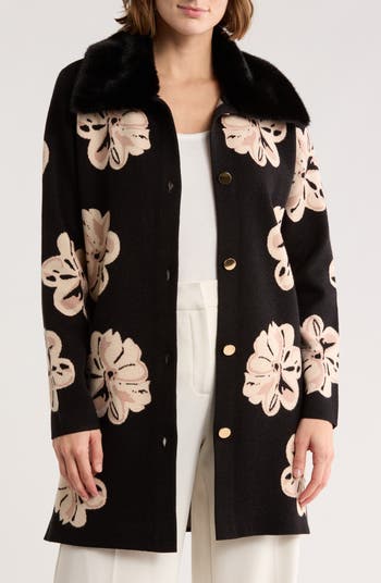 A plush faux-fur collar frames a longline cardigan done in a bold print to elevate your look while keeping you toasty and warm.